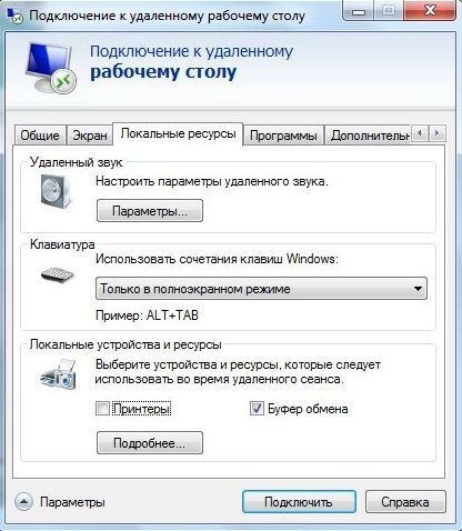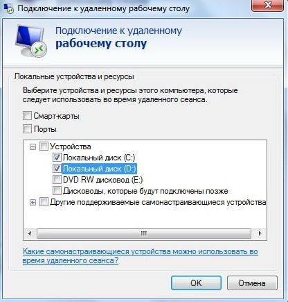 Выберите локальные диски, которые нужно подключать к Удаленному рабочему столу.