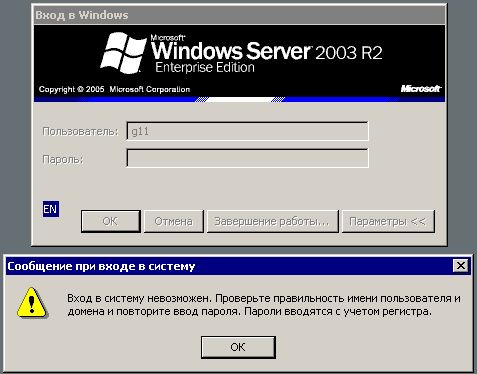 Вход в систему не возможен. Проверте правильность имени пользователя и пароля.