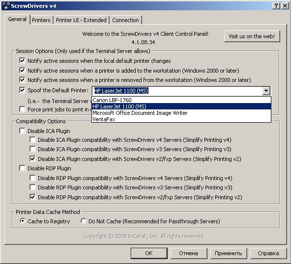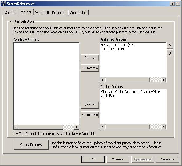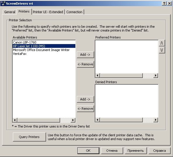 Выбор принтеров, которые будут подключать на удаленном рабочем столе.